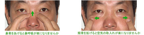| ○鼻呼吸にとって大切な鼻骨、頬骨 アトピーの人や喘息の人、花粉症で悩んでいる人、それらの人を拝見しますと必ずと言っていいほど鼻骨が下がっています。鼻骨は鼻の一番上の方にあり、両眼の間にある骨です。 「鼻骨が下がっているかも」と思われる方は、両手中指の先で鼻骨にあてがい、その骨を上(額の方)にちょっと上げてみてください。それだけで鼻からの呼吸がしやすくなりませんか? 次に、また両手中指の先を両眼外側のすぐ下にある出っ張った頬骨にあてがい外側に開いてみてください。すると空気の取り入れが良くなった感じになりませんか? |