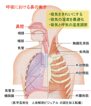 ○やはり鼻呼吸が大切アトピーの人に限らず、今、口呼吸の人が大勢います。 鼻呼吸の大切さについては西原克成博士の著書をご覧になっていただければと思います。 私たちの鼻は驚くほどに素晴らしい能力を持っています。外気温がマイナスの極寒だろうと酷暑だろうと、空気がどれだけ乾燥していようと、鼻から空気を吸って喉にたどり着くまでの、ほんの短い時間に、吸気を身体にとって最適な温度と湿度の状態にしてくれます。さらに空気中に漂っているホコリやばい菌なども排除してくれるという、本当に素晴らしいものです。外気中のマイナス要素から身体の内部を守る最初のとりでです。 しかし、口で呼吸をしている人はこの素晴らしい能力の恩恵に授かれません。空気中のばい菌やホコリは喉まで直接入ってきますし、冷たい、あるいは熱い空気は喉や気管支を直撃します。湿度の低い空気から酸素を取り出し血液中に送り込むことは肺にとっては効率の悪いことで負担をかけてしまうことになります。 ですからアトピーに限らず体質の弱い人、疲労のたまっている人は、まず口呼吸を改める必要があります。 |
