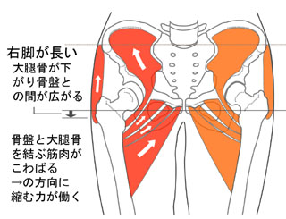 仮に右脚と骨盤との間が健全な場合より離れているとします。すると太ももの骨(大腿骨)を骨盤につないでいる筋肉は常に引っ張られている状態になります。筋肉は引っ張られますと縮もうとする方向に力が入りますので、つまり“こわばり”ますので痛みを発する原因となります。