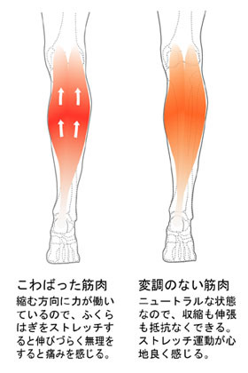 筋肉がこわばった状態は、縮む方向に力が働いている状態ですので、このときに伸ばす方向に力を加えると痛みを感じることになります。