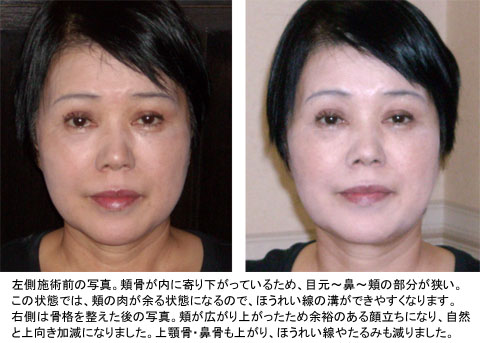 ほうれい線を気にされている方は、頬骨を広げ、頬骨と上顎骨が上がるように調整することによってほうれい線が目立たなくなるようにすることが可能です。