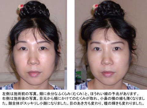 光と陰のコントラストが顔の見え方を決めますので、少しでも凹みが深くなると陰ができ、それが凹みを余計に強調することになるので、ほうれい線がハッキリ見えてしまい「老けた」感じが出てしまうことになるのでしょう。さて上の写真でも、よく見ますと、左側の写真にはほうれい線のなりかけ(予兆)があります。むくみを改善し、頬がスッキリした右側の写真では、それも薄くなっています。
