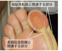解剖学の本によりますと長母趾屈筋も母趾外転筋も母趾の先端までは及んでいません。しかし実際のところ、母趾の先端や内側の部分がコチコチに硬くこわばっている人が多くいて、そのこわばりを解消すると、これらの筋肉のこわばりが改善します。