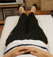 右の写真では分かりづらいかもしれませんが、全身を調整し、内側広筋に力が伝わる状態にしました。こういう状態になると、膝の内側を特別意識しなくても、普通に座っただけで自然と膝の内側に力が集中するようになります。両膝を揃えて座ることも苦心することなくできるようになります。