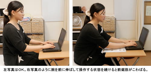 すっかりIT社会になった今日、仕事でパソコンばかりを相手にしているのであれば、常に肩や腕を前方に出し続けていることになります。つまり常に前鋸筋を働かせているわけです。キーボードを使う時、肘をデスクに付けてアームレストに手根を乗せた状態で操作していればさほど前鋸筋を使うことはないかもしれませんが、そうではなく肘を浮かせた状態でダイレクトにキーボードを操作したり、あるいはキーボードと自分の間に書類などを置いて、腕を伸ばした状態で操作したりしていますと、前鋸筋は間違いなくこわばります。