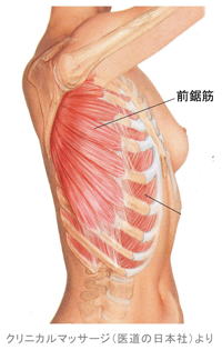 前鋸筋は背中側から脇腹にかけて肩甲骨の内側にある筋肉ですが、肩(肩甲骨)や腕を前方に出す働きをします。自分の肩がどうも前に出ているようで気になっている人は、多くの場合、前鋸筋のこわばりによるものです。