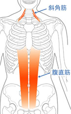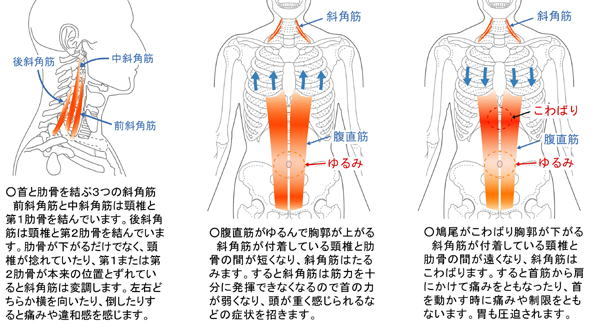 | @お腹が冷えると首の調子が悪くなる “寝ちがい”までいかなくても「首筋が痛い」「頭が重たく感じる」「首の動きがおかしい」といった症状とお腹の冷えとはとても深い関係があります。 首の不具合に深く関係する斜角筋という筋肉があります。前斜角筋、中斜角筋、後斜角筋と3つの斜角筋がありますが、これら斜角筋は首の骨である頸椎と肋骨を結んでい て呼吸運動を助けたり首の運動や首の安定に働いています。首の調子が悪くなるといった場合、この斜角筋がおかしくなることが多いのです。さて、お腹が冷えによって斜角筋がおかしくなる仕組みを説明します。 “冷え”ということは“熱エネルギーが足りない状態”と同じことです。“お腹”とは筋肉に置き換えると腹筋になりますが、ここでは腹直筋を取り上げて考えます。腹直筋はスポーツ選手などがお腹に力を入れたときに横に2つ、縦に4つくらいにボンボンと分かれて見えるあの筋肉です。この筋肉は肋骨の上から数えて5〜7番目の骨と恥骨を結んでいて、そこにおへその穴が開いています。冷えて熱エネルギーが足りなくなるとおへそ辺りの腹直筋の活動が衰え筋肉がゆるみます。すると二つの状態が現れます。一つは腹直筋が伸びてしまい、骨盤と胸郭(肋骨)の距離が離れ胸郭が上に上がってしまう状態。もう一つは、お臍のところにできた筋肉のゆるみを補おうとして、ちょうどみぞおちの辺りが縮んでしまう場合で、この筋肉の縮みが胸郭を引き寄せるため肋骨が下がってしまう状態。臨床的には、この二つの状態がよく見受けられます。 ・腹直筋がゆるんで肋骨が上がっているしまうと 肋骨が上に上がると、頸椎と肋骨との間が狭まります。するとそこを結んでいた斜角筋はたるみ加減になりますので、斜角筋は筋力を発揮することが困難になります。頭を支える力が弱まります。頭が重たく感じられるようになり、下を向く姿勢が辛くなってきます。仰向けの状態では首を上げることが困難になってしまい、起き上がるとき手で首を支えなければ起き上がれなかったりするようになってしまいます。 ・みぞおちがこわばり肋骨が下がってしまうと 肋骨が下がると、斜角筋の付着部である頸椎と肋骨の間が本来の位置より離れますので、斜角筋は引っ張られこわばります。縮もうとする力が余計に働きます。すると筋肉全体として伸びが悪くなりますので、首を動かす動作がスムーズにできなくなります。また、筋肉のこわばりは痛みに直結しますので、何もしなくても“首筋から肩にかけて痛い”ということになります。 さらに、みぞおちのこわばりは胃を圧迫しますので、胃が不調になるかもしれません。 |