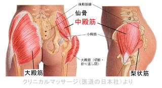 右の写真のようなポーズを取ったとき、重心が親指側にあって安定しているようであれば大丈夫ですが、そうでなければ筋肉を整える必要があります。上半身と下半身の間の角度をつけるための要となる筋肉は中殿筋です。中殿筋はお尻の筋肉ですが、一番表層にある大殿筋の一層奥にあります。