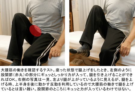 大腰筋の働き具合を見るテストとして、椅子に座った状態でもも上げをしてみてください。左と右手比べてみてください。大腰筋の働きに問題がなければ、股関節の筋肉だけでももをお腹の方へ軽々と引き付けることができるはずです。股関節にしっかりとした収縮感が感じられます。働きに問題がある場合は、ももを引き上げるとき股関節の筋肉というよりは上半身を後に動かした反動を利用してももを上げてしまいます。ももを上げた状態でも、股関節のところに力強さは感じられません。