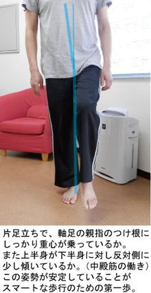 さて、歩く動作は軸足となる後足と前に進むために出す前足が交互に入れ替わることの連続です。それは足踏みをすることで理解できると思います。足踏みは片足立ちを交互に繰り返すということですので、まず片足立ちの姿勢が安定して軽やかにできるかどうかがとても大切なことです。