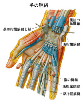 指を曲げたりのばしたりする動作は、腕の内側にある屈筋と表側にある伸筋が、伸びたり縮んだりすることで行われますが、手首の手前から筋肉は腱と呼ばれる細い筋になって指の関節に付着していきます。そしてこの腱には通り道がありまして、それは関節をまたぐところでは、鞘と呼ばれるトンネルのようなところを通っています。