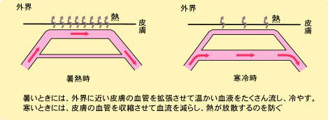 冬場など外気温が低くなりますと、体は37℃という深部体温を維持するため、血液の温度を下げないように働きます。具体的には、体表の毛細血管に流れる血液の量を大きく減らすのですが、それは自律神経(交感神経)の働きによるものです。毛細血管への血流量が減りますので、皮膚の細胞の働きは鈍くなりますし温度も低くなってしまいます。ですから「冷え」というつらい症状となってしまうのです。 |