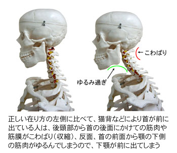 今は老若男女を問わず、パソコンを扱う人がとても増えています。ところで、パソコンを扱う姿勢はどうしても肩が前に出てしまい、首と顔が落ちて猫背の姿勢になりやすい欠点があります。さらに椅子に座っている時間が長くなりますと、背中も丸くなり、猫背が定着してしまう危険性が高まります。 右の写真の右側は、猫背の人の首と顔の骨格の感じを表現したものです。首が前に出ますと正面を向くときに少し上向き加減で顎を突き出すような形になってしまいます。この状態を筋肉的な観点で見ますと、後頭部から首の付け根のあたりは少し上向き加減なので、筋肉を収縮させた状態(こわばり)になります。すると筋肉の拮抗関係(片面が収縮すると反対の面はゆるんで伸びる関係)から、首の前面、喉の上から顎の底にある筋肉や筋膜はゆるんで伸びた状態(ゆるみ過ぎ)になります。ですから、下顎は前の方に少しスライドすることになります。そして、この状態が今回取り上げている「受け口」の状態であり、原因は猫背の姿勢ということになります。 |