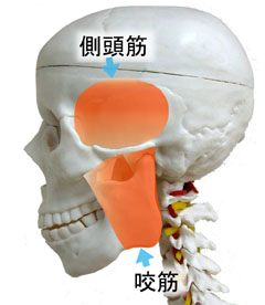 噛む筋肉を専門的には“そしゃく筋”といいます。そしゃく筋には外側から触れることのできる咬筋と側頭筋があります。