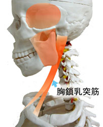また、そしゃく筋は側頭骨と鎖骨や胸骨を結ぶ胸鎖乳突筋と連動しますので、噛むことが少なく、そしゃく筋がゆるむと胸鎖乳突筋もゆるみます。すると鎖骨や胸骨が下がってしまいます。そして、その下がってしまった胸に連動するように顔の骨も下がってしまう場合があります。額の骨も下がるのですが、すると後頭部の骨(後頭骨)は反対に上がりますので、骨盤の仙骨部から始まる背中の筋肉(脊柱起立筋群)は張ってしまい額やこめかみの筋膜を引っ張ります。それが偏頭痛や頭痛を起こす原因の一つになります。
