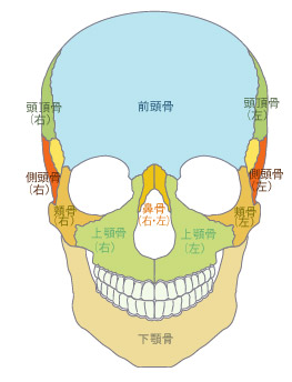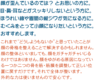 | 上顎骨・頬骨が下がると頬が下がり、鼻の下が長くなる。 加齢とともに上顎骨・頬骨は下がりやすくなるようです。下まぶたのたるみなども上顎骨・頬骨の動揺と関係が深いと考えられます。上顎骨・頬骨を本来の位置に戻すと顔の感じがだいぶ変わるでしょう。 上顎骨が寄るとほうれい線が目立つ。鼻呼吸にも影響。 口の中、舌で上アゴを探ったとき、中央のライン(凸)がしっかり確認できる人は上顎骨が中央に寄ってしまっている人です。骨が寄ってしまっている分、ほうれい線も目立つようになります。また上顎骨は鼻腔に影響しますので鼻からの息の取り入れに関係します。上顎骨を正しい位置に戻すと口の中は広くなり、鼻呼吸もしやすくなるでしょう。ほ うれい線も目立たなくなるでしょう。目が不調‥前頭骨・上顎骨・頬骨を調整します。 目がおさまっている眼窩は前頭骨・頬骨・上顎骨によって形成されています。なんとなくまぶたの開閉に引っかかりがあるとか、どちらかの目がぼやけている感じがするなど、これら3つの骨を整えたり、脳の台座である蝶形骨や後頭骨を調整します。 耳の不調‥側頭骨や鼻骨を調整します。 耳の高さが左右で違う。イヤホンをした時どちらかが抜けやすい、耳掃除の時どちらかがしにくいなど耳の穴の大きさや形が左右で違うみたいだ。こんな時は、耳の穴のある側頭骨が左右でずれていることが考えられます。 耳はまた鼻とも耳管でつながっていますので、耳鳴りが気になるなどの場合、側頭骨と鼻骨を調整してみるのも一つの方法です。 眉間のたてジワ‥リキミが入っているということです。 眉間のたてジワは、リラックスしているつもりでも実はリキミがあることの証です。どうして力んでしまうのでしょうか? 精神的なことが原因している場合もたくさんあると思いますが、整体的にとらえると、やはり頭蓋骨がゆがんでいるということになります。頭部は全身に命令を出す脳がおさまっているところですから“骨格がゆがんでいるので仕事が半分しかできません”というわけにはいきません。ゆがんでいても機能を維持しなければならないので自然とリキんでしまう、そう考えることもできます。現に頭蓋骨を整えると、眉間のたてジワは薄くなります。自然体になれるからではないでしょうか。そうして精神的にも開放感がでてくると整体師として嬉しいかぎりです。 眉の位置が左右で違う、目の大きさが違うなどは前頭骨の傾きを整える必要。 眉は前頭骨にありますので左右の位置が違っているなどの場合は、前頭骨がずれていることを物語っています。前頭骨がずれていると目の大きさも左右で違うようになります。目尻のシワが左右で違うなどの場合も、前頭骨・頬骨などを整える必要があります。 アゴのズレ‥片噛みの癖‥そしゃく筋(側頭筋・咬筋)の調整と頭蓋骨の調整 片方の歯ばかりで噛んでしまう“片噛み癖”の人はかなりいます。両方でちゃんと噛んでるいるという人でも、食べるときの頭の傾き具合で片噛み癖と同じようになってしまう人もいます。 顔では噛んでいる方のそしゃく筋(側頭筋・咬筋)がこわばり、噛んでいない方のそしゃく筋はゆるんでしまいますので、噛んでいる方にアゴの骨も前頭骨・頭頂骨なども引き寄せられ、顔がゆがむことになります。噛んでいる方の頬はシャープになりますが、反対側はボワーンとしてしまいます。そして体も噛んでいる側にねじれます。 顔のむくみ‥小顔を目指す方はぜひ頭蓋骨を整えてみてください。 顔にかぎらず骨格がゆがみ本来の位置よりずれていれば、それだけで血流やリンパの流れは悪くなります。細胞一つ一つへの血流やリンパの流れが悪くなれば老廃物や水分は停滞気味になります。ほとんどの人が、普段の顔にむくみを抱えているといってもよいでしょう。 不思議に見える光景ですが、揉んだりマッサージしたりするわけでもないのに骨格を整えるとその瞬間から速やかに血流が活発化します。すると細胞がイキイキするのか、血色はよくなり、素肌もしまってハリと光沢がでてきます。スッキリとした顔に変わります。 |