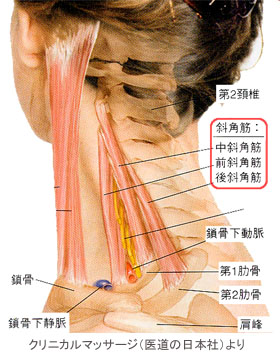 首の筋肉で、そしゃく筋と連動して働くものに斜角筋、胸鎖乳突筋があります。咬筋がこわばりますと斜角筋がこわばります。斜角筋は首を回す時に働く筋肉ですから、これらがこわばりますと首筋の伸びが悪くなり、後を振り向くなどの時に痛みを感じたり、十分に首を回すことができなくなったりします。