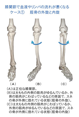 足は心臓から遠く離れていますから、心臓のポンプ作用による血流を循環させる力は弱くなっています。また静脈やリンパは自分自身の力で血液やリンパ液を心臓に戻す機能はありません。周りの筋肉の働きによって、つまり牛の乳搾りのような作用によって前方に運ばれます。膝関節が歪んでいると血管やリンパ管のホースがよれてしまうような状態になりますので、通りが悪くなり、水分が停滞してしまうと考えることができます。この場合は、マッサージなどの手段ではなく、整体によって膝関節を正常に整えることが必要です。