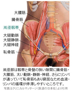 股関節のところには鼡径部があります。鼡径部の狭い隙間に太い動脈や静脈、リンパ、そして筋肉(大腰筋・腸骨筋)が通っていますので、股関節や骨盤に歪みがあると静脈やリンパ圧迫されて流れが悪くなります。