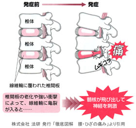 腰椎椎間板ヘルニア(右図)や脊柱管狭窄症は器質に異常が現れた病気です。ですからマッサージなどの手法は病気の改善には効果がありません。