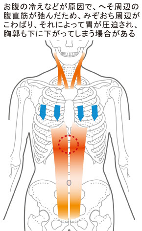 お腹が冷えていると腹筋にこわばり(収縮ままの状態)の部分ができ、それによって胸が下に引っ張られます。すると首の前面、喉、顔面の筋膜も引っ張られる状態になります。それによって前頭部に頭痛が生じる場合があります。目も開きにくくなるため、目の奥が痛くなることもあります。女性ですと、普段よりバストの位置が下にあるように感じられると思います。