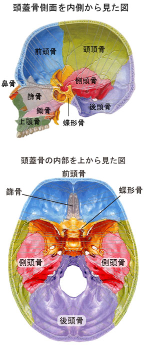 脳は頭蓋骨の中に納まっていますが、それ自身の骨格構造は持っていません。そしてほとんどが水分でできています。(脳の水分量は85%で、血液の80%よりも多い)頭蓋骨の内部では硬くて丈夫な硬膜に覆われ、蝶形骨を台座にして篩骨や後頭骨に乗っかり安定性を保っています。