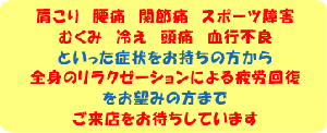 姿勢が悪い、体の使い方が偏っているなどの他、今の社会ではストレスとなるものがたくさんあるため、皆さんのからだはつらくなっています。もみほぐしたり、整体療法や足のリフレクソロジーを施したりすることによって、そのつらくなってしまっているからだからストレスを取り除き、芯から温かく伸びやかで、リラックスした状態になっていただくのが私の願いであり目標です。