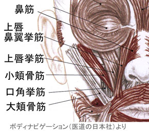 ところでこれらの骨が下がってしまう大きな原因は、頬骨の下から口にかけての筋肉(大・小頬骨筋、上唇挙筋、上唇鼻翼筋、鼻筋)がこわばっているからです。多くの人のその部分はカチカチで軟骨と間違えるくらいです。笑ったり、口を動かしたり、いろいろな表情を長年に渡ってつくってきたため、それらの筋肉が硬くこわばってしまったのだと考えられます。これらの筋肉のこわばりをていねいに取っていくだけでも、顔の感じはだいぶ変わると思います。