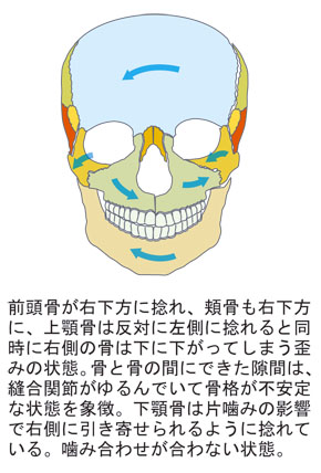 前頭骨が右側に捻れ、それとともに頬骨も右側に捻れ、上顎骨は反対に左側に捻れ、下顎骨は左側に捻れている。耳の硬さは右側の方が高く、目を大きく開けようとすると額の筋肉を強く使ってしまう(額にシワをつくる)。鼻も頬もどことなく下がっていて、笑みを作るため口角を上げようとすると頬の肉が邪魔に感じてしまう。顎のエラも以前より目立ってきた感じに思える。顔の歪みが大きくなっている人は、このような具合に感じるかもしれません。