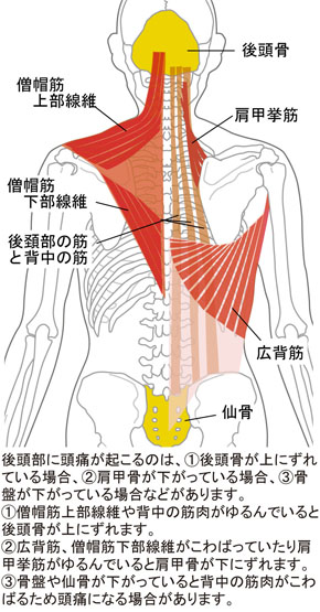 後頭部の後頭骨には骨盤から背中を通じてつながっている背筋や肩甲骨につながっている僧帽筋があります。例えば後頭骨が上にずれている場合、それらの筋肉は緊張してこわばります。あるいは骨盤(仙骨)が下がっていたり、肩甲骨が下や外にずれている場合もそれらの筋肉はこわばります。そしてそのこわばりによって後頭部に頭痛がもたらされることになります。